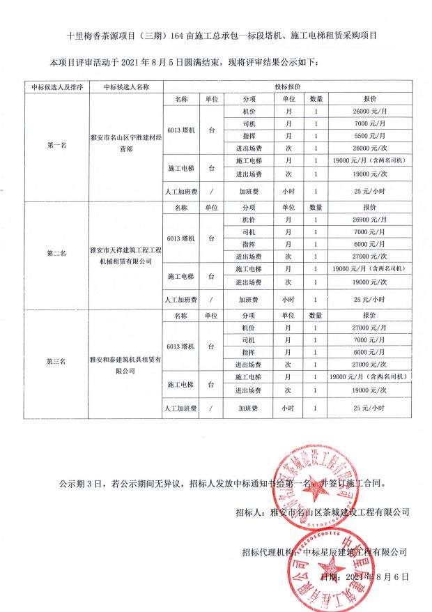 十里梅香茶源項目(三期)164畝施工總承包一標段塔機、施工電梯租賃采購中標公示