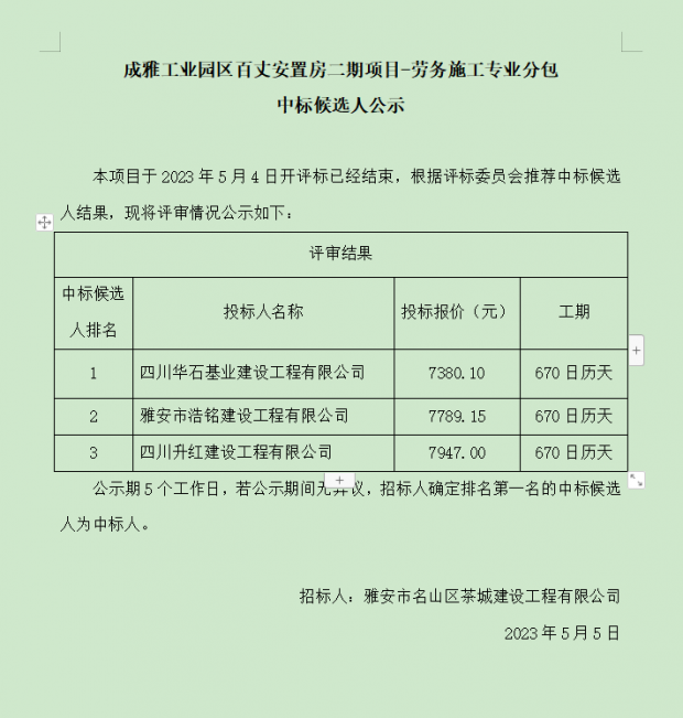 成雅工業(yè)園區(qū)百丈安置房二期項目-勞務施工專業(yè)分包中標候選人公示