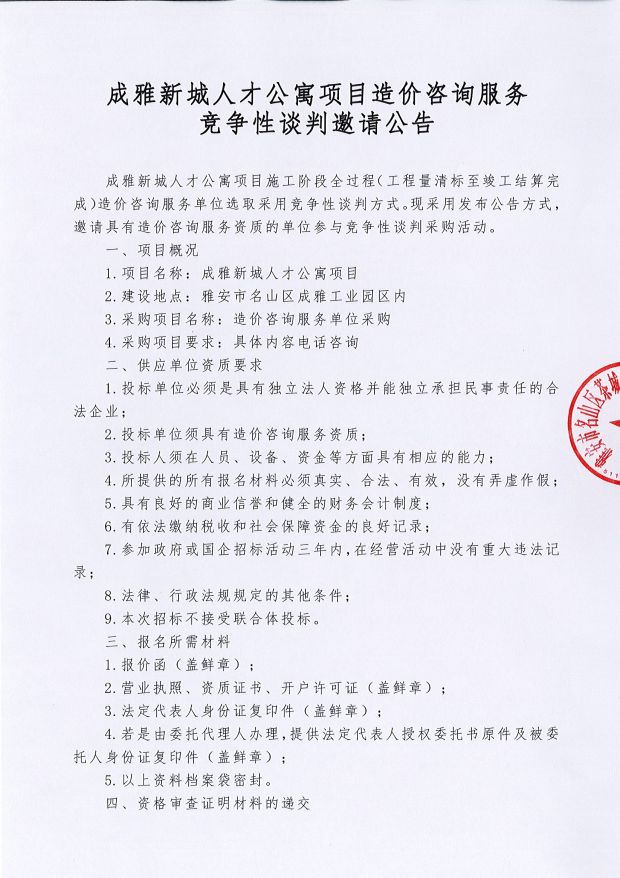 成雅新城人才公寓項目造價咨詢服務(wù)競爭性談判邀請公告