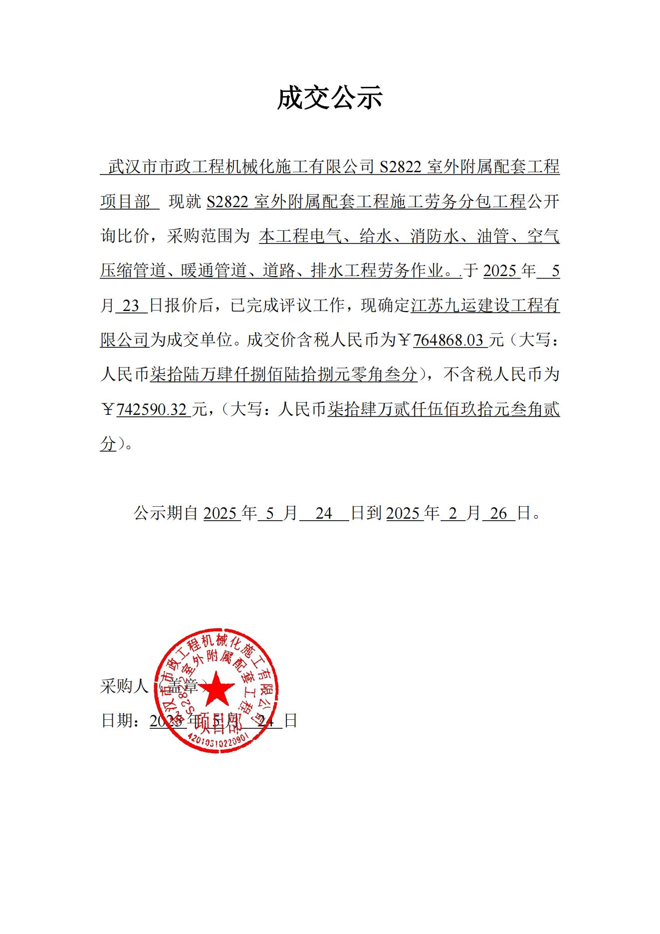 S2822室外附屬配套工程施工勞務(wù)分包工程成交公示