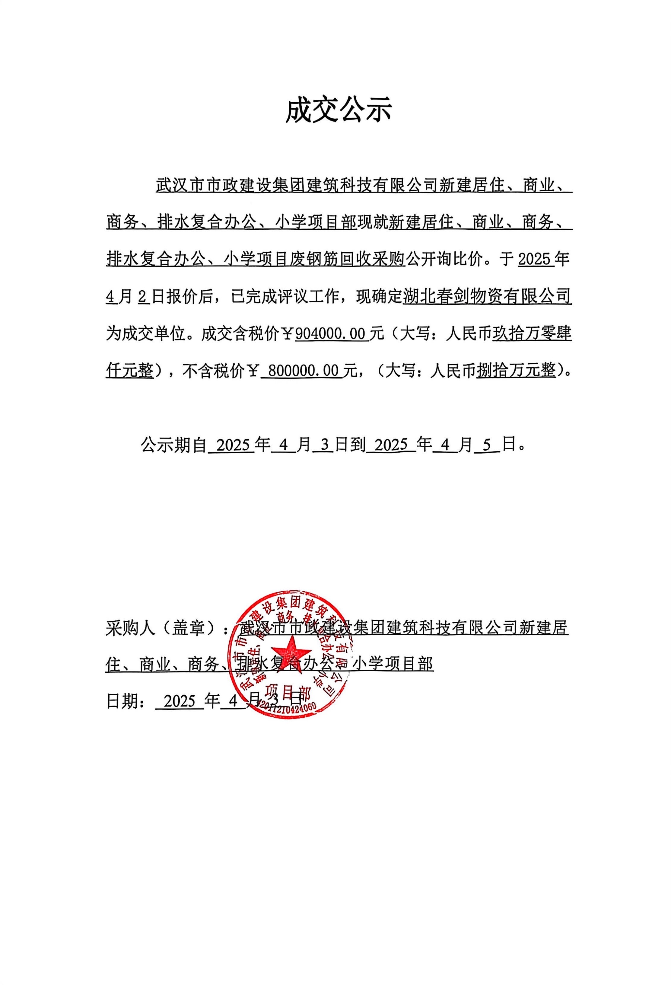 武漢市市政建設(shè)集團建筑科技有限公司新建居住、商業(yè)、商務(wù)、排水復(fù)合辦公、小學(xué)項目廢鋼筋回收采購成交公示